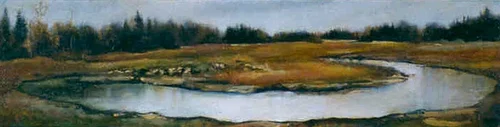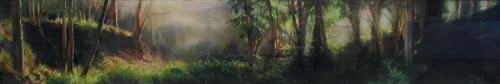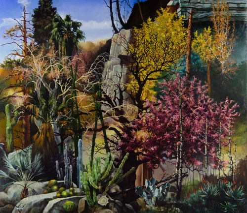 The allusions crowd my thoughts about the results of this match. Unlike other landscape paintings where I had an actual reference point in real experience from which to base my assessment of the finished work, this painting has no such real place. It is an impossible garden. My other landscape paintings aspire to what Kenneth Clark coined “the landscape of fact,” where the forms and references to the natural world need to be recognized, believable, and illustrative of the natural world, as an essential function of their message. Arboretum is a fantasy world. Although each element adheres to standards of realistic depiction, the overall composition could not be construed as factual.