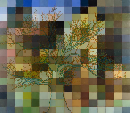 This painting is autobiographical. I know it’s a cliché, as nearly every artist will claim the same intrinsic function. However, I set out to purposely insert specific references to places either utilized in previous works, or awaiting such use in the archive of images I kept on hand in the studio. This was a form of “exorcism” whereby I scoured my photos, drawings, paintings and digital resources for the raw material. My plan was to include all or part of everything “tree” from this archive until I reached a stalemate. The match between the painting took six months of exclusive work and ended when I could no longer see a “move.”